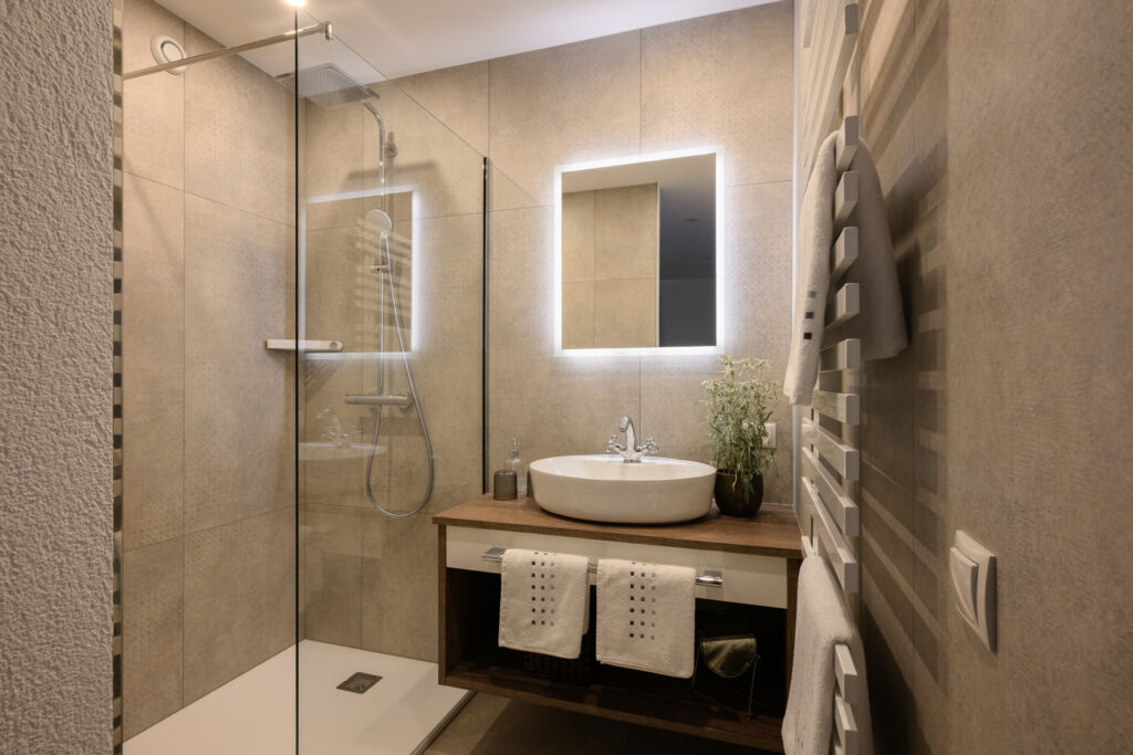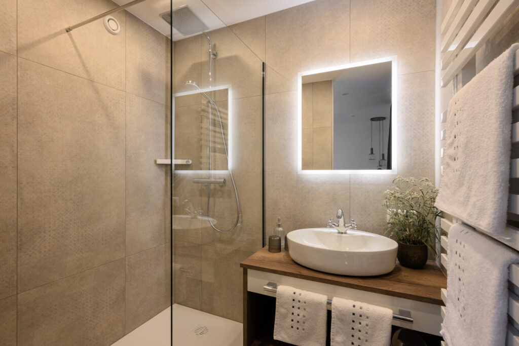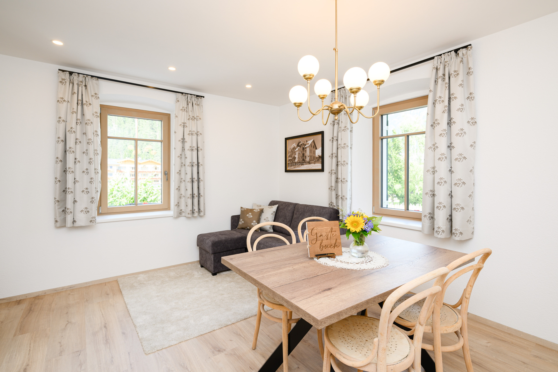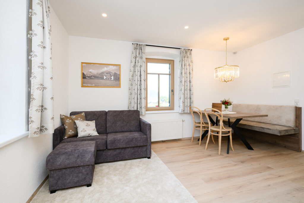 Die Ferienwohnung 1926 liegt ebenfalls im Erdgeschoß und hat 45 Quadratmeter. Sie bietet einen Wohnsalon mit Bettsofa und einen Essbereich mit offener Küche im klassischen Villen-Charakter. Im gemütlichen Schlafzimmer erwacht man mit dem traumhaften Blick auf die von den sonnengeküssten Berggipfeln. Das Badezimmer erweist einen besonderen Flair mit einer begehbaren Dusche, einem Waschtisch sowie einer separaten Toilette.